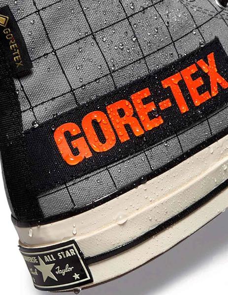Zapatilla Converse Chuck Taylor gris estampada con cuadros negros y letras Goretex escritas en color naranja. Bambas All Star resistentes al agua ideales para vestir a la moda manteniendo tus pies secos en época de lluvia. Elaborada con lona impermeable y cordones que repelen la humedad. El modelo 171444C sale a la luz dedicado especialmente para el público más exigente, que busca un zapato cómodo, que no filtre agua y muestre carácter deportivo. Su estilo innovador ha convertido estos tenis Converse Gore-Tex en uno de los sneakers más buscados de la nueva temporada e incluye en su diseño los dos clásicos detalles que nunca faltan en la firma Converse Chuck 70, parche en el tobillo y símbolo All Star vintage. Además, se completa con amortiguación OrthoLite y suela de goma. ¡Un consejo! Acompaña estos playeros con algo especial y date un capricho, por qué no te vas a comprar un chubasquero Rains a juego.