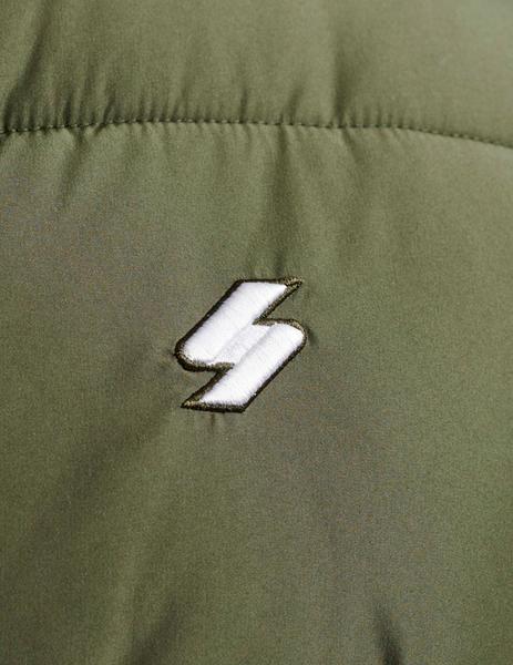 Plumas sin mangas Superdry verde oliva para hombre. Modelo Sports Puffer, Color Dark Moss, Artículo M5011156A GUL. Chaleco de tela acolchada repelente al agua fabricado en poliéster reciclado con forro polar interior, bolsillos exteriores, cremallera, ajuste slim fit y logotipo de la letra S bordado a la parte frontal. Elige esta prenda exterior multifuncional para armonizar tus looks de forma sencilla, no pesa y funciona igual de bien para resguardarse de frío y lluvia.