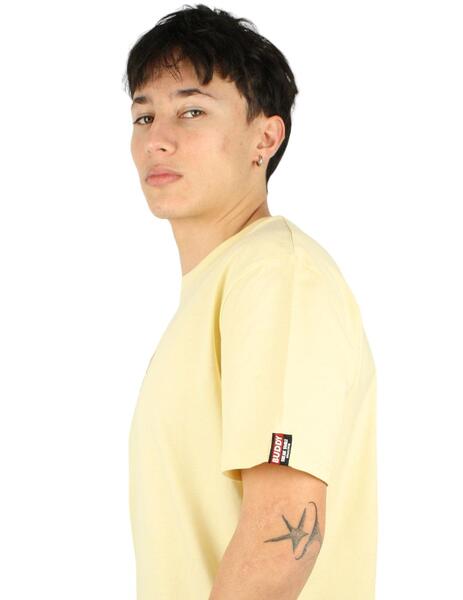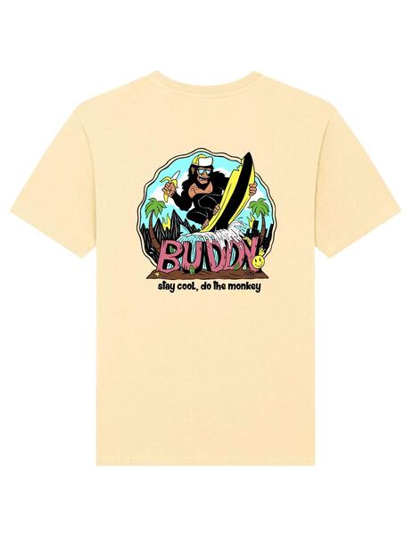 Camiseta Buddy Monkey color mantequilla para hombre diseñada con letras en el pecho y dibujos por la espalda. Este original gráfico playero del mono haciendo surf con un plátano está tremendamente relacionado a la filosofía Buddy, nos gusta la playa, los deportes al aire libre y sobretodo las camis guapas que están hechas en algodón orgánico. Además, la prenda es sostenible, posee certificado GOTS y viste en talla normal por lo que resulta muy fácil de intercambiar entre chicas y chicos. En cuanto a la técnica empleada para integrar las ilustraciones sobre la playera debes saber que se ha utilizado lámina de transfer DTF con tacto flexible. Ya lo sabes, esta es la canción del verano ¡Stay cool, do the monkey! #buddy #ropabuddy #sudaderasbuddy