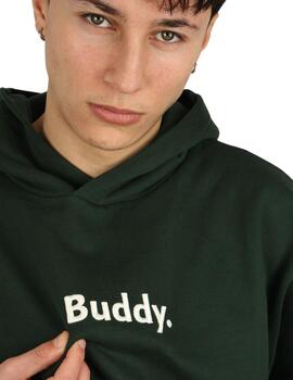 Sudadera Buddy Future Oversized verde botella con capucha. Prenda de moda urbana con ADN streetwear confeccionada a base de algodón y corte ancho. El nombre de la marca Buddy está perfectamente bordado sobre el pecho con hilo abultado en forma de relieve. Además, combina 4 slogans a la espalda con las frases, Grow future thinking. The Buddy Eco Friendly collection since 1978. Sustainable & Organic y Bye bye fast fashion. #buddy #thisisbuddy #ropabuddy