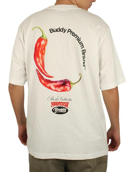 Camiseta Buddy Chili blanca. Prenda de moda streetwear confeccionada en algodón, manga corta, cuello redondo y corte regular. Su diseño incluye el sello Buddy cosido a la manga izquierda. #buddy #ropabuddy #tiendabuddy